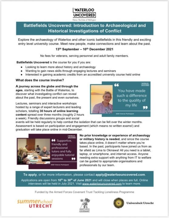 Waterloo Uncovered (the charity that combines archaeology at the famous battlefield with veteran care and recovery) is looking for participants to join a friendly and fascinating online course as part of the Armed Forces Covenant Fund Trust’s Tackling Loneliness programme. No previous background in archaeology necessary – just a clear interest.
