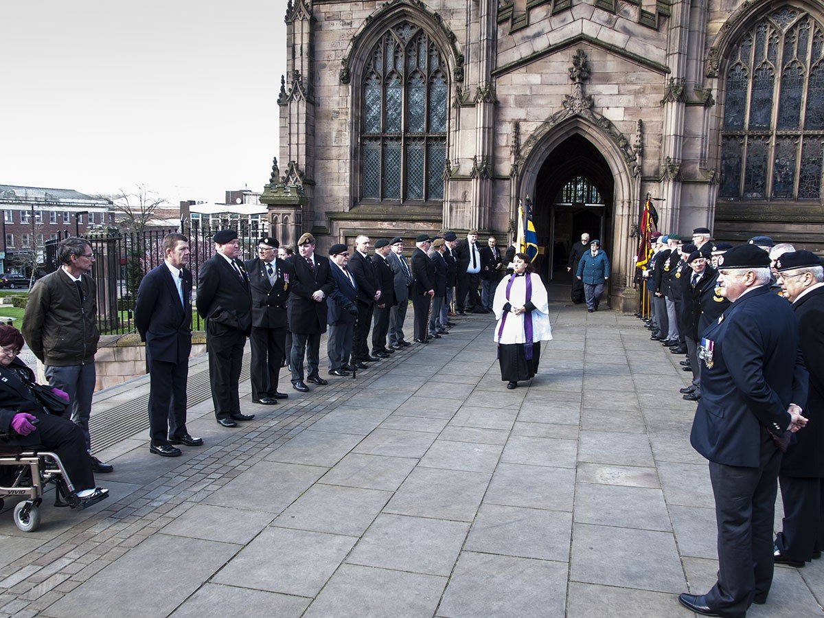 At 2pm on Tuesday 21st March 2017 Family, friends and the Military Community gathered together, initially at Rotherham Minster and thereafter at Rotherham Crematorium to say farewell to Edward (Ted) Hodson (member of the Royal Engineers Association, Aden Veterans Association and founder member of the MCVC) who passed away on the morning of Tuesday 7th March 2017. A Guard of Honour, Standards and a Bugler playing the Last Post ensured that Ted’s final journey was one fitting of a member of the military community who was very well known within the borough. RIP Ted, you will never be forgotten.