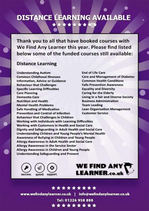 We would like to update you with the latest FREE courses we have available including Understanding Autism, Behaviour that Challenges, and Mental Health Problems. For those of you that have enrolled onto FREE courses with us in the past, you will know we are a Yorkshire-based organisation that specialises in placing people onto FREE training courses nationally. For those that haven’t enrolled onto a course with us please feel free to find out more about us on our website www.wefindanylearner.co.ukor call our friendly team on 01226 958 888.