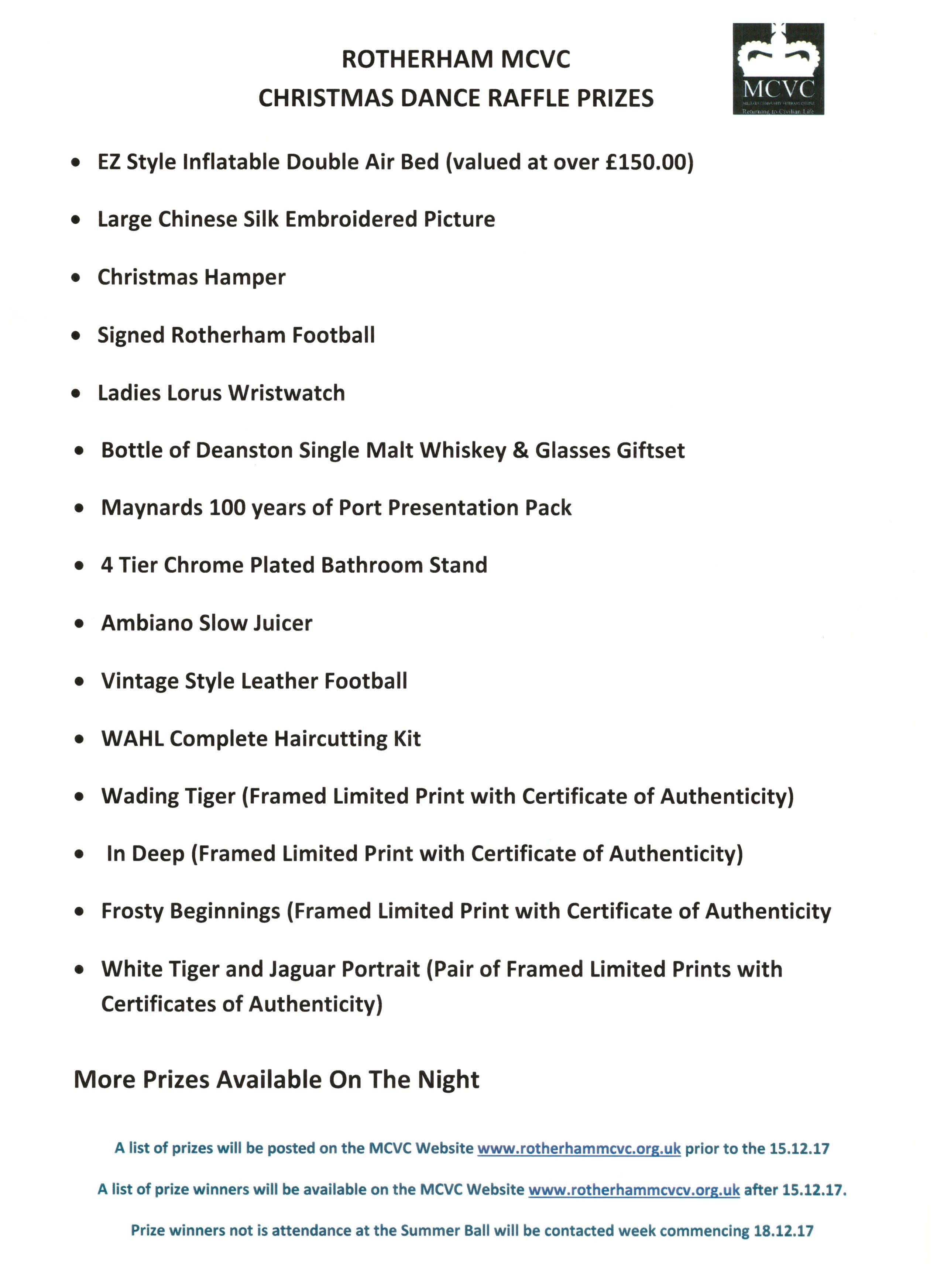 Purchase your raffle tickets now to be in with a chance of winning one or more of the great prizes in the MCVC Christmas Party / Dance Raffle (see below) taking place on Friday 15th December 2017. Tickets are only £1.00 each or £5.00 for a book of 5 tickets.