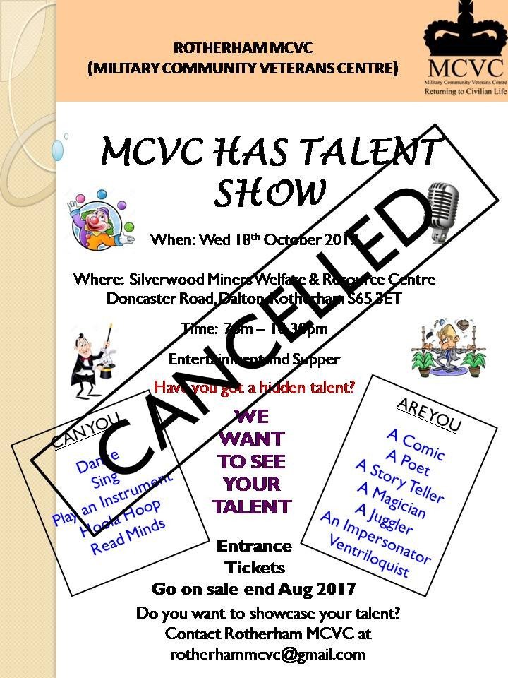 Unfortunately it has been necessary to cancel the ‘MCVC Has Talent Evening’ scheduled for Wednesday 18th October 2017, this being due to insufficient acts coming forward to take part. We would like to thank everyone who volunteered to take part in the event to showcase their talents and we are truly sorry that we aren’t in a position to see this through to fruition.