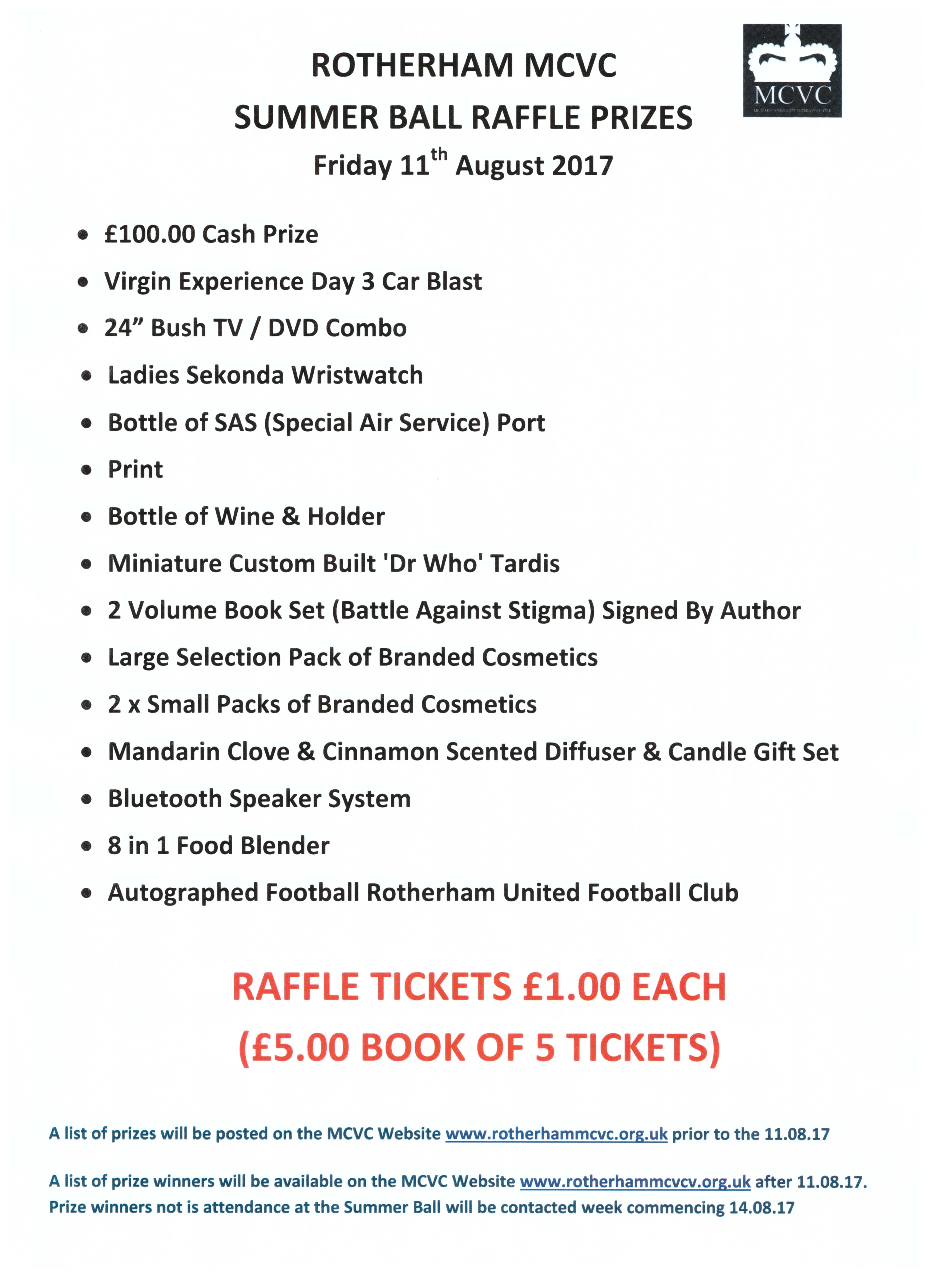 Purchase your raffle tickets now to be in with a chance of winning one or more of the numerous prizes in the MCVC Summer Ball Raffle (see below) taking place on Friday 11th August 2017. Tickets are only £1.00 each or £5.00 for a book of 5 tickets.
