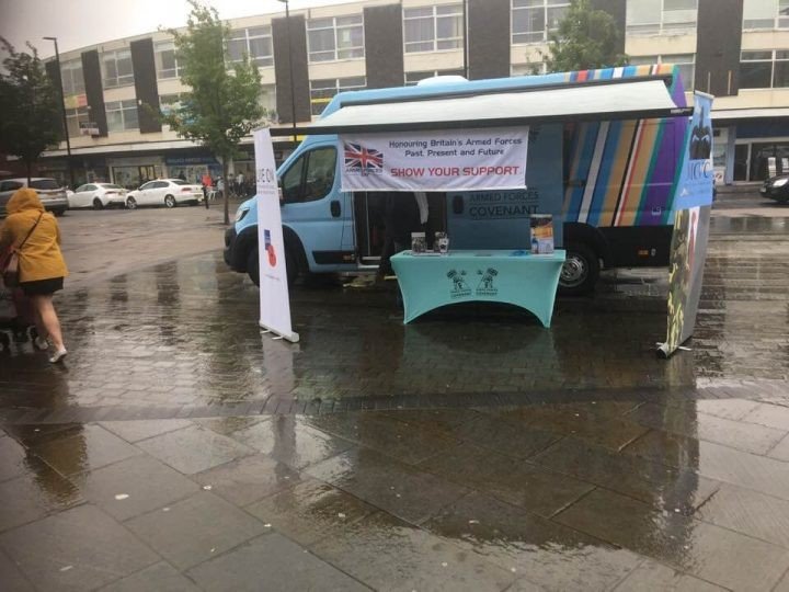 Volunteers have braved the weather to promote Armed Forces Day The Royal British Legion and the MCVC why not pop along and say hello …..