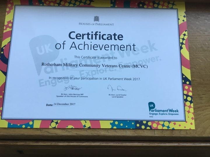 Rotherham MCVC has received a certificate of achievement from the Houses of Parliament, signed by the Speakers of both the House of Commons and House of Lords, in recognition of the participation we made during UK Parliament week in 2017.