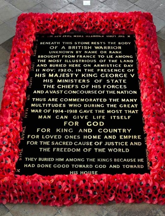 At the west end of the Nave of Westminster Abbey is the grave of the Unknown Warrior, whose body was brought from France to be buried here on 11th November 1920. The grave, which contains soil from France, is covered by a slab of black Belgian marble from a quarry near Namur. On it is the following inscription, composed by Herbert Ryle, Dean of Westminster:
