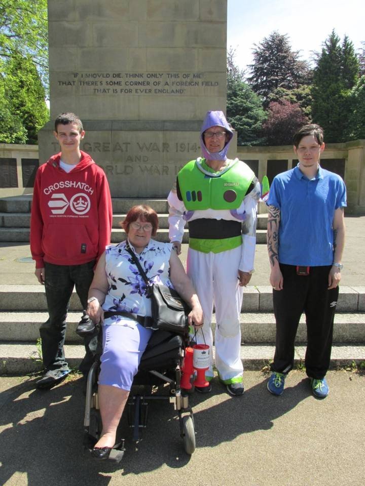 Barbara Harper, Buzz Lightyear (aka Craig Shaw), Philip Carr and Josh Ingham at the start of their War Memorials sponsored walk (Clifton Park, Rotherham to Barkers Pool Sheffield) midday 27th May 2017, in aid of Rotherham MCVC (Military Community Veterans Centre). Thank you.