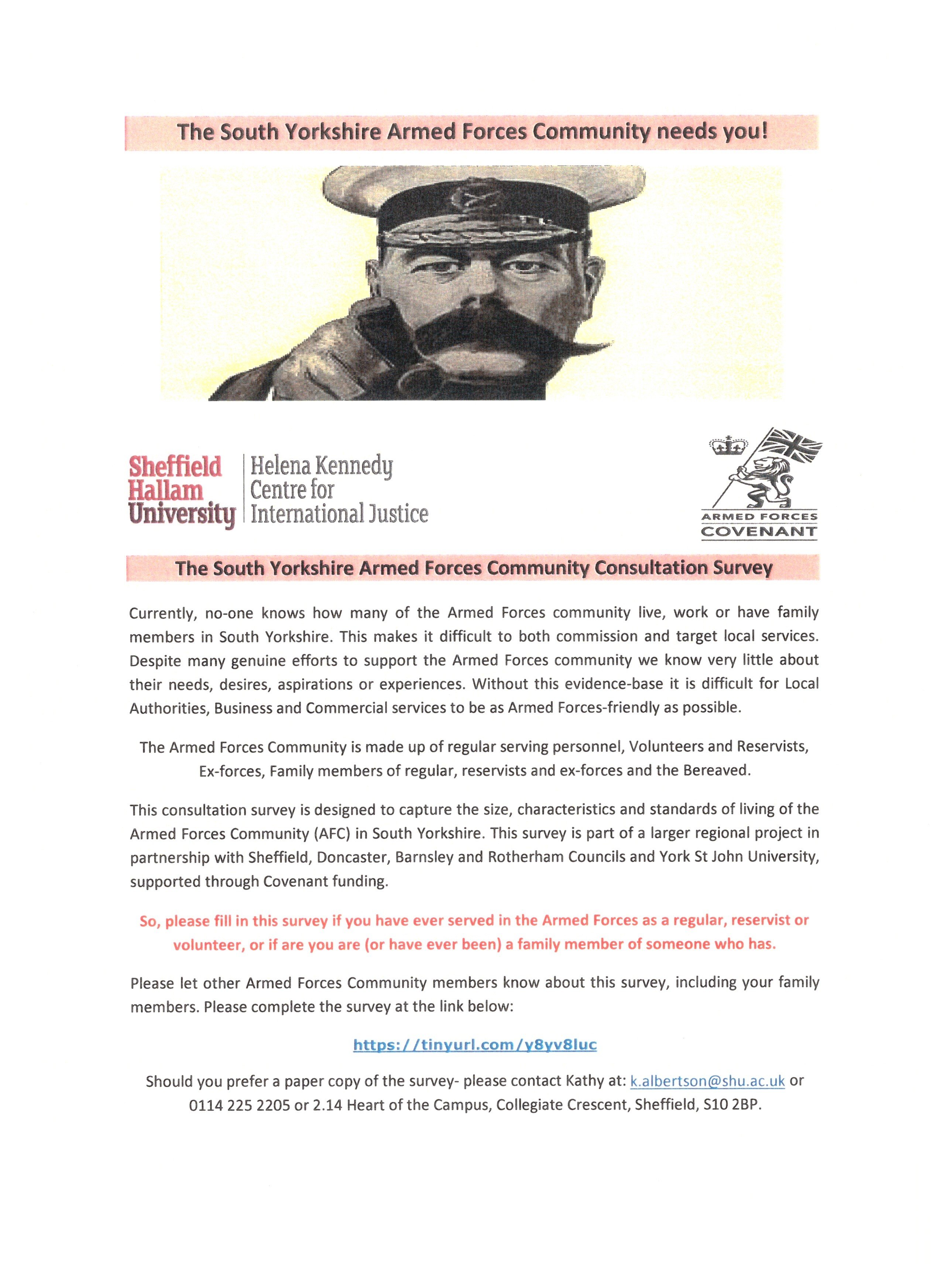 If you haven’t already done so, please fill in the survey (completely anonymous) if you live in South Yorkshire and you serve or have ever served in the UK Armed Forces as a Regular, Reservist or Volunteer, or if you are (or have ever been) a family member of someone who serves / has served. Your assistance in spreading the word about this survey far and wide across the Armed Forces Community within South Yorkshire would be appreciated.